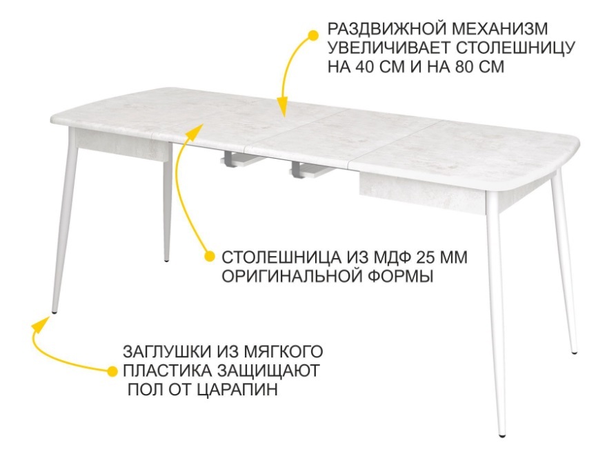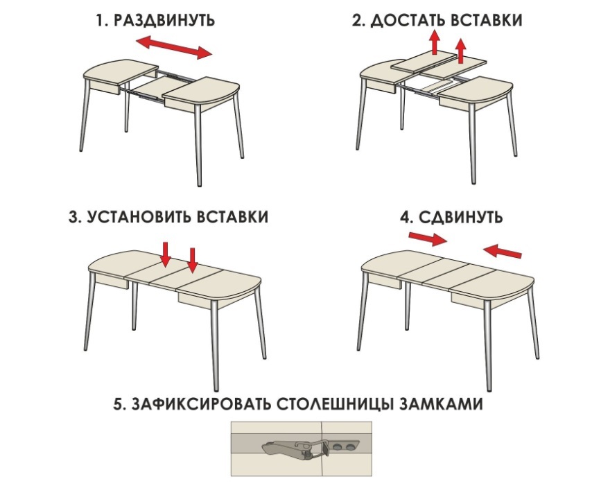- Надежный механизм позволяет увеличить длину столешницы на 40 и на 80 см и обеспечивает длительную безопасную эксплуатацию стола.