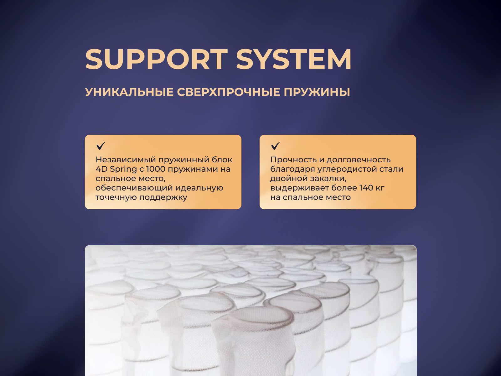 Блок независимых пружин 4D Spring (1000 штук на спальное место). Проволока пружин изготовлена из углеродистой стали двойной закалки, что позволяет выдерживает большую нагрузку.