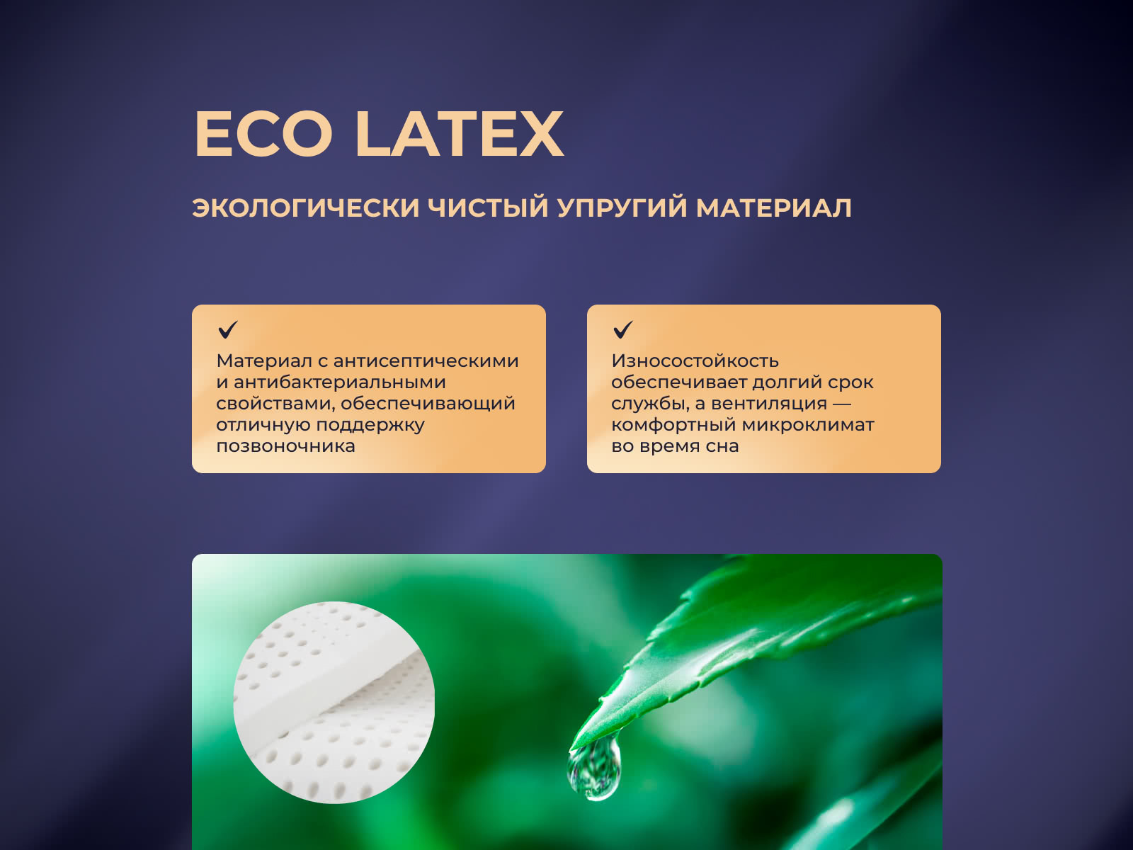 - ECO Latex – 2 см. Это современный материал, который отличается особой комфортностью и повышенной износостойкостью, а также обладает высокими антисептическими и антибактериальными свойствами. Обеспечивает правильную и упругую поддержку позвоночника во время сна, способен выдерживать большое давление и быстро восстанавливать первоначальную форму.