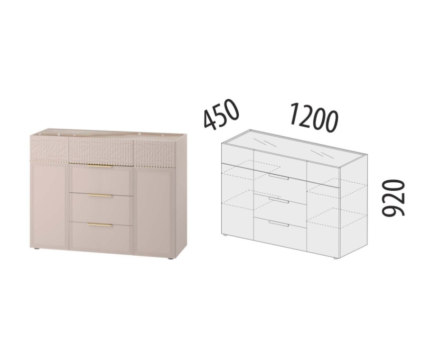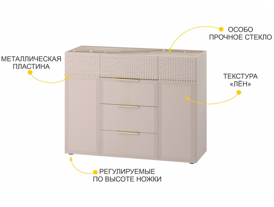 • Комод произведен из МДФ и ЛДСП повышенной плотности. Материал устойчив к механическим и термическим воздействиям. ЛДСП выдерживает min 300 циклов на истирание, что почти в 5 раз больше, чем требуется по ГОСТу (min 65).