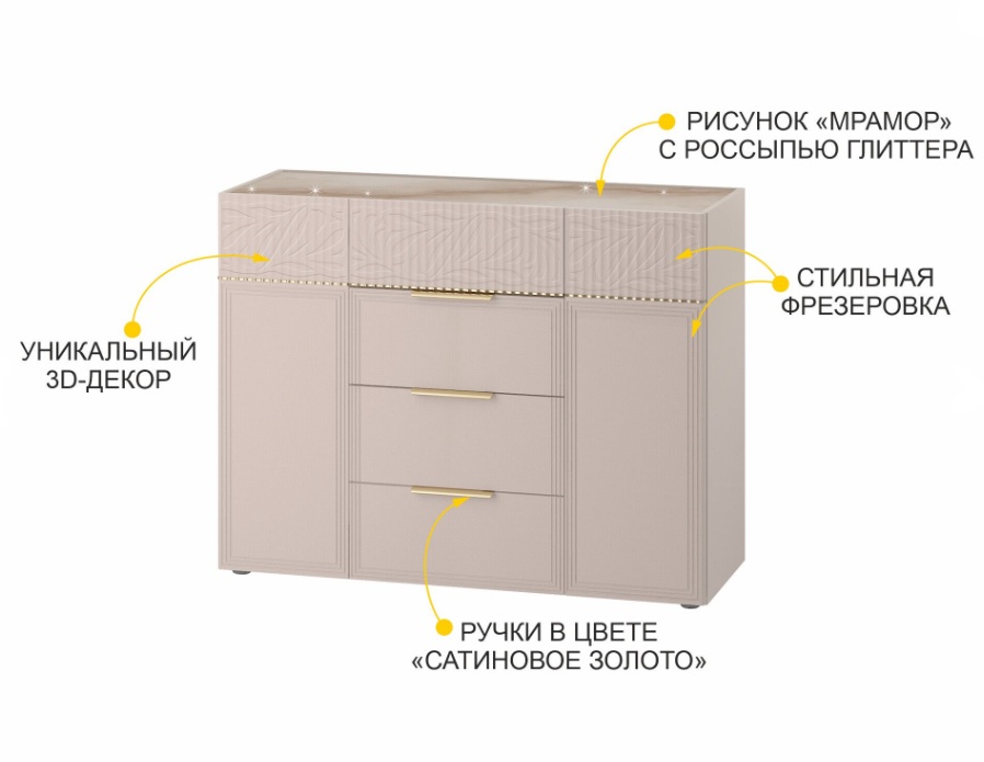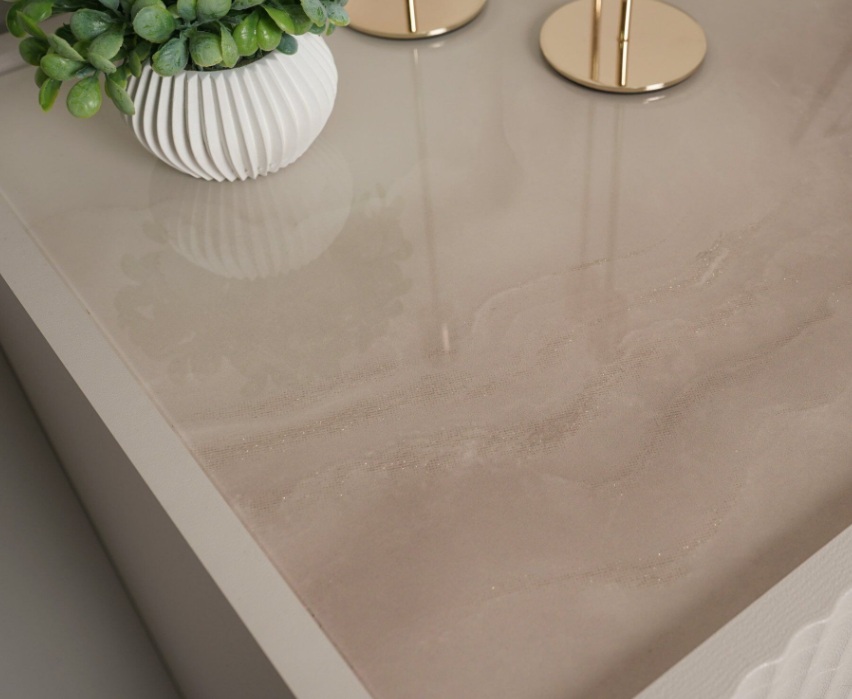 • Стеклянный топ комода декорирован дизайнерским рисунком «Мрамор». Легкое мерцание глиттера придает поверхности глубину и добавляет в интерьер нотку роскоши.