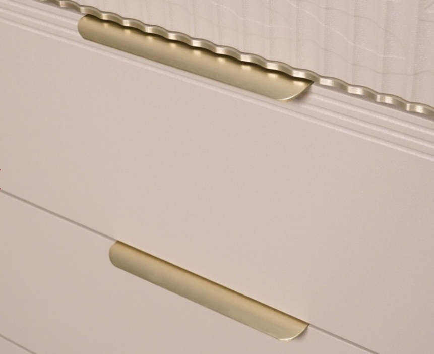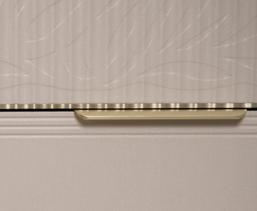 • Металлическая пластина на фасаде толщиной 5 мм проходит обработку по собственной технологии покрытия, которая придает ей изысканный оттенок «сатинового золота». Она гармонично сочетается с цветом фурнитуры и повторяет геометрию вертикальных реек.