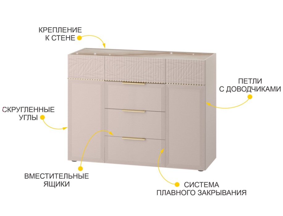 • Вместительные ящики комода оснащены системой плавного закрывания скрытого монтажа, благодаря чему модулем приятно и удобно пользоваться.