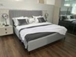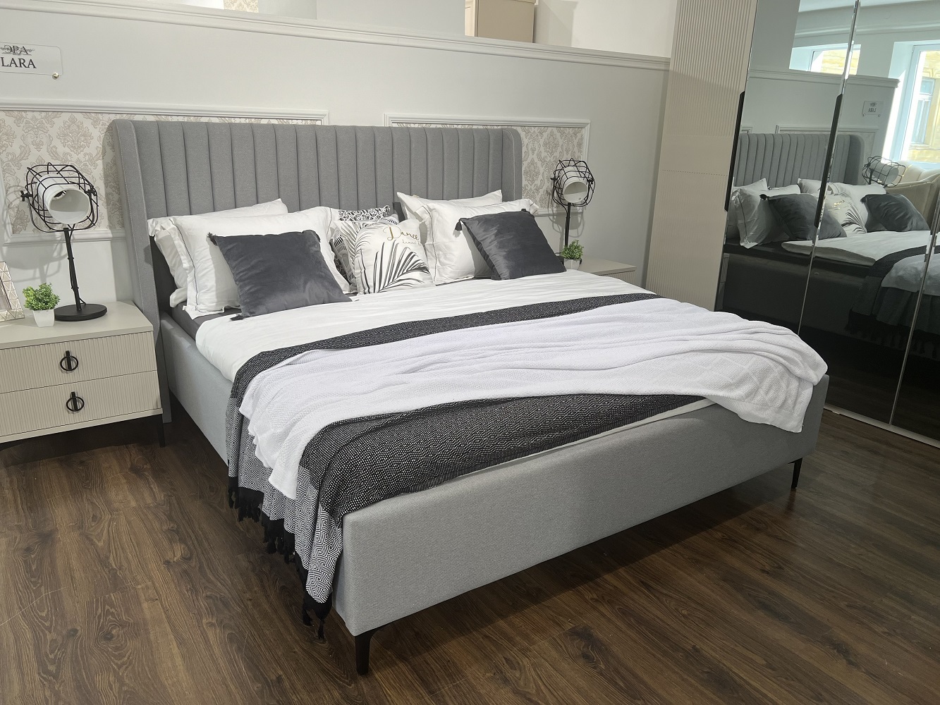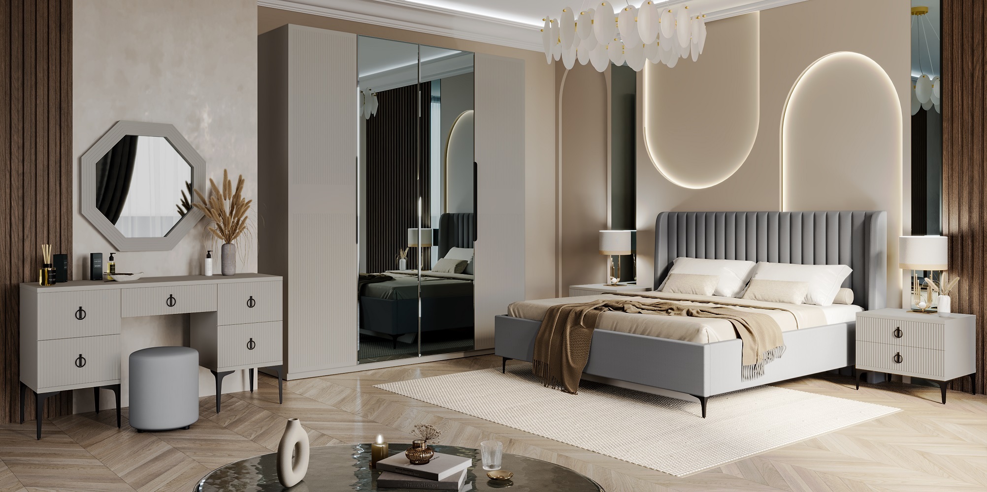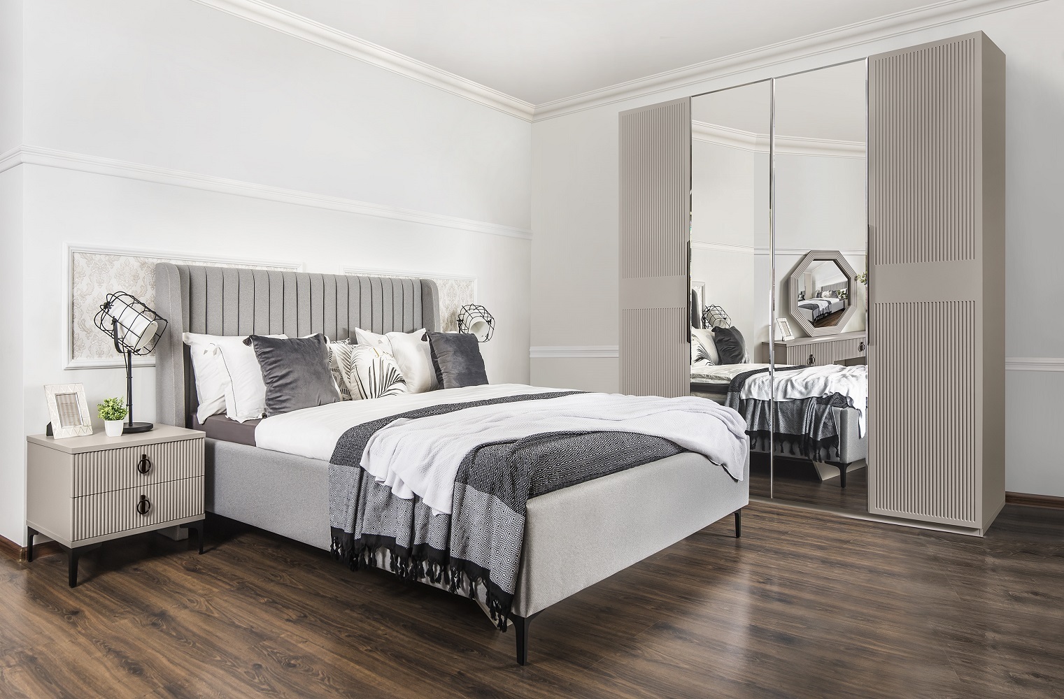 Доминантой интерьера спальни является мягкая кровать Стелла. Оригинальная простежка и строгий лаконичный силуэт поддерживают общую стилистику, а форма изголовья с изогнутыми краями образуют уютное пространство для спокойного и крепкого сна. Металлические ножки высотой 15 см позволяют делать уборку при помощи робота-пылесоса.