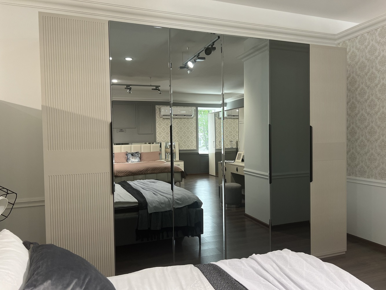 Завершают коллекцию вместительные шкафы "Стелла" которые представлены в 2-х размерах — 4-х и 6-ти дверный. Складной механизм фасадов экономит место, плавная эргономичная форма ручки рейлинга позволяет удобно пользоваться шкафом, стандартное внутреннее наполнение с двумя функциональными комодами, полками и штангой сохранят ваши вещи в порядке.