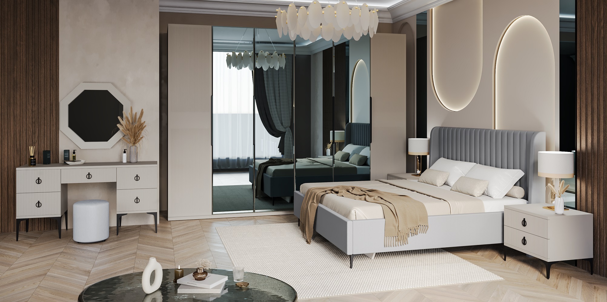 Доминантой интерьера спальни является мягкая кровать Стелла. Оригинальная простежка и строгий лаконичный силуэт поддерживают общую стилистику, а форма изголовья с изогнутыми краями образуют уютное пространство для спокойного и крепкого сна. Металлические ножки высотой 15 см позволяют делать уборку при помощи робота-пылесоса.