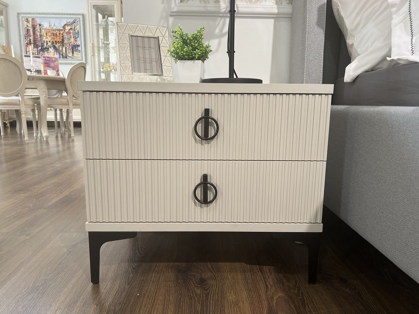 Дополняют кровать стильные и функциональные прикроватные тумбы "Стелла". Их рельефные фрезерованные фасады и элегантные ручки делают их настоящим украшением спальни. Ящики оснащены современными бесшумными механизмами с доводчиком. Внутри достаточно места для хранения личных вещей.
