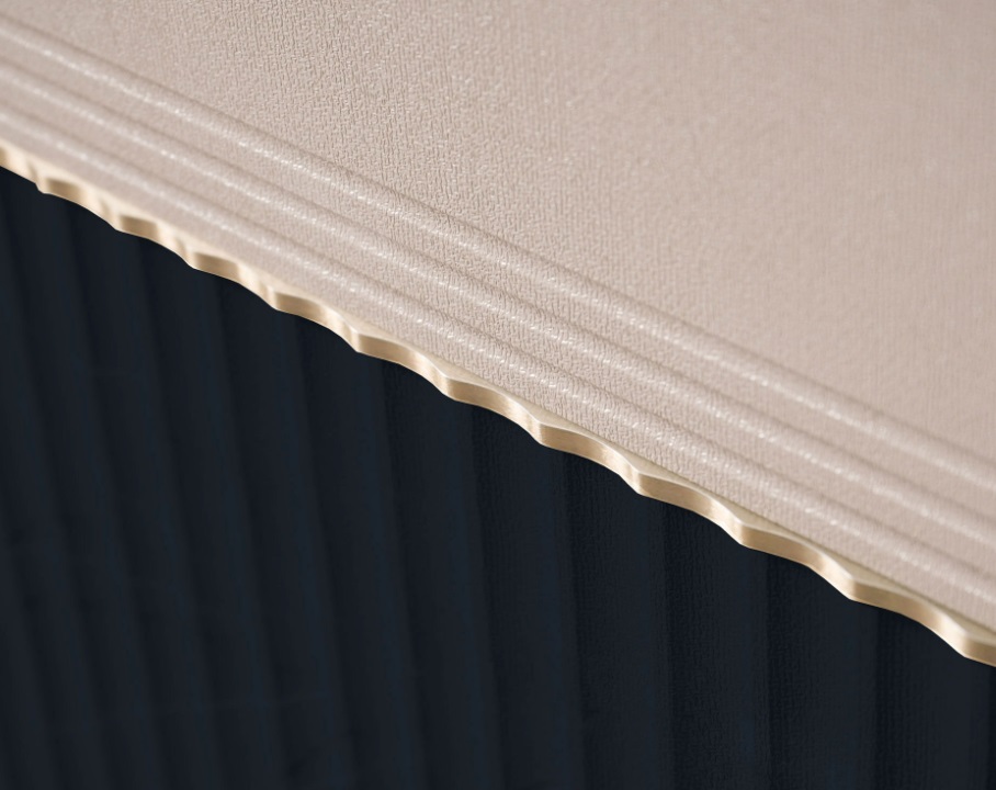 • Металлическая пластина на фасаде толщиной 5 мм проходит обработку по собственной технологии покрытия, которая придает ей изысканный оттенок «сатинового золота». Она гармонично сочетается с цветом фурнитуры и повторяет геометрию вертикальных реек.