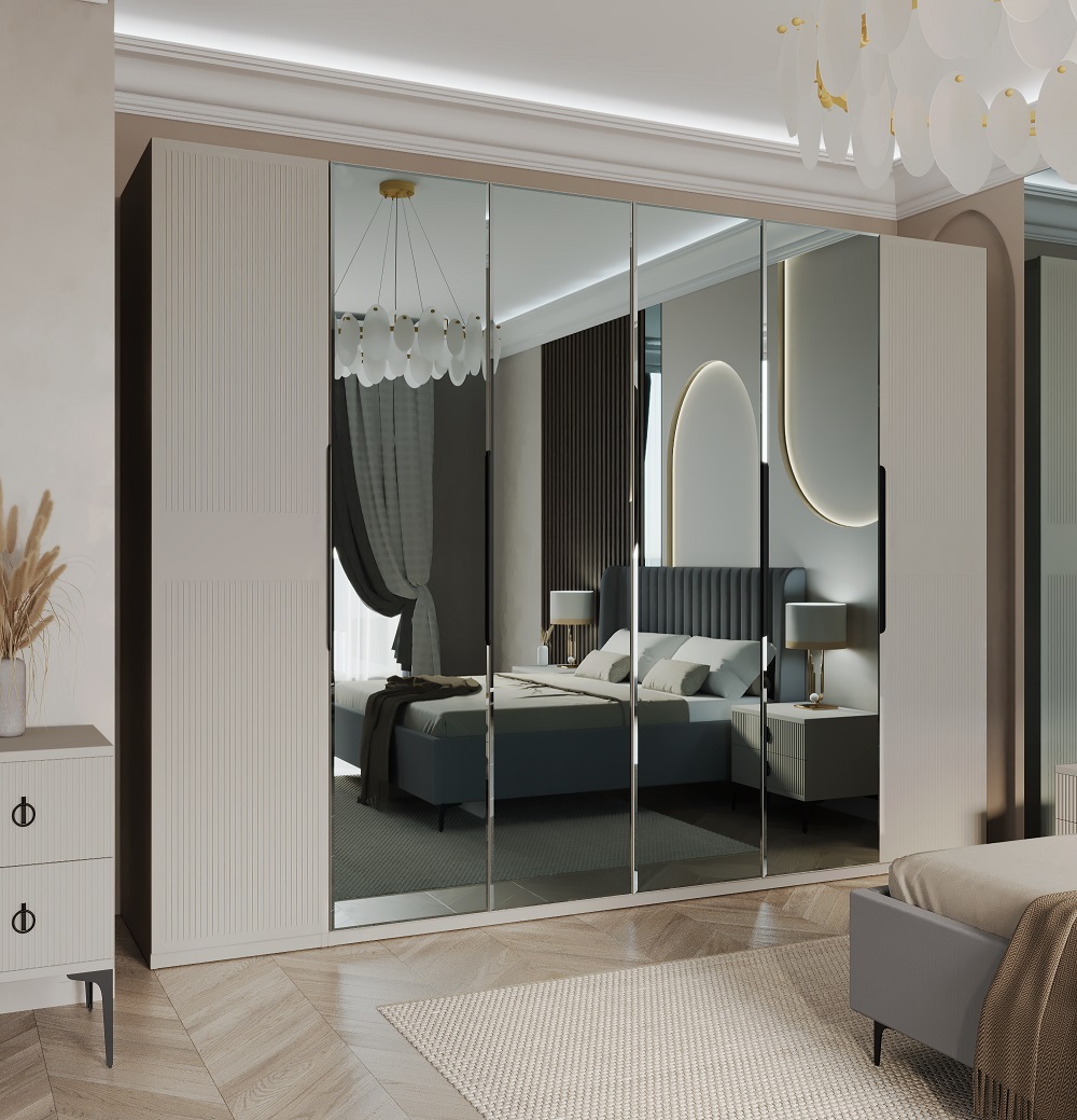 Завершают коллекцию вместительные шкафы "Стелла" которые представлены в 2-х размерах — 4-х и 6-ти дверный. Складной механизм фасадов экономит место, плавная эргономичная форма ручки рейлинга позволяет удобно пользоваться шкафом, стандартное внутреннее наполнение с двумя функциональными комодами, полками и штангой сохранят ваши вещи в порядке.