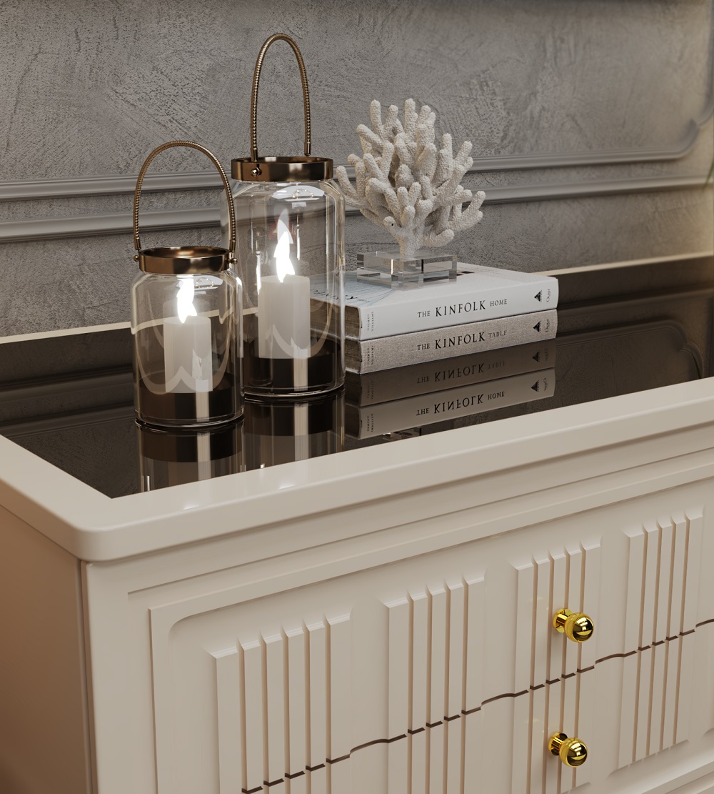 Фасад: МДФ с фрезеровкой и вставкой из пластика под латунь/хром + стеклянная дверь с фрезеровкой МДФ;