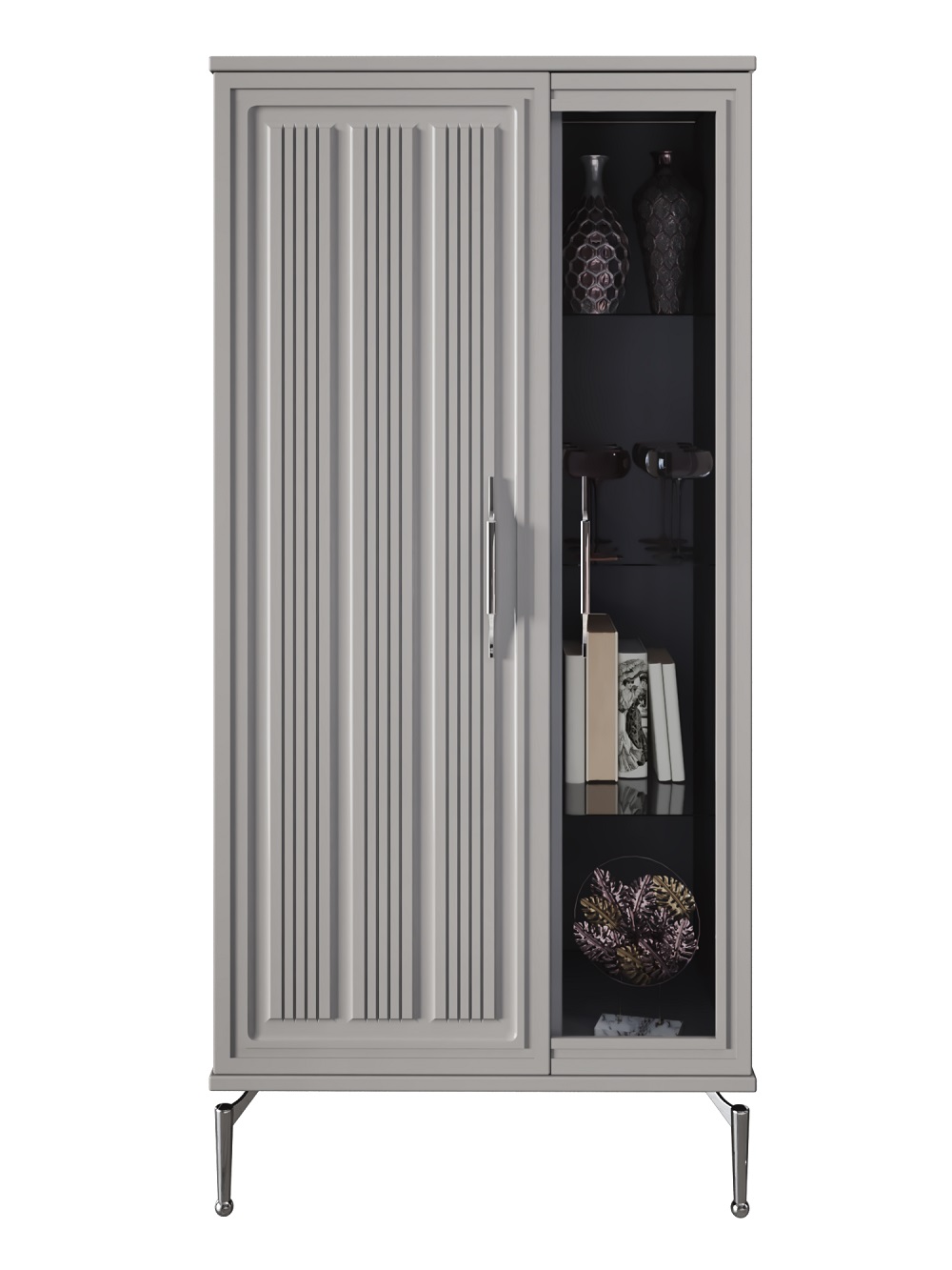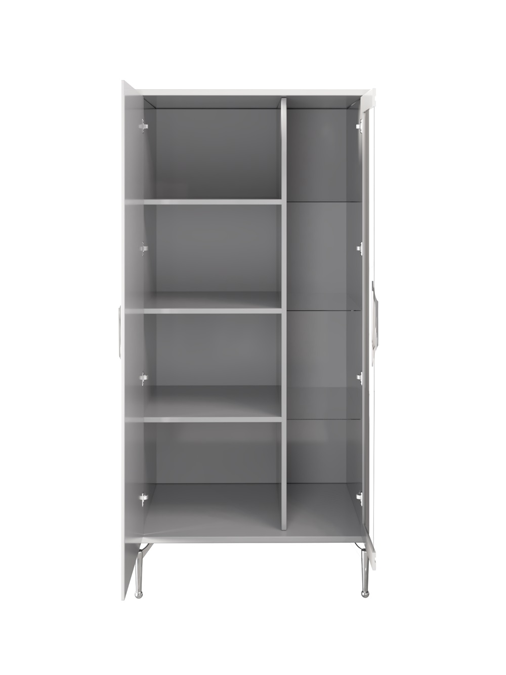 Внутреннее наполнение: Шкаф разделен на 2 секции: за щитовой дверью – 3 щитовые полки, за дверью со стеклом – 3 стеклянные полки;