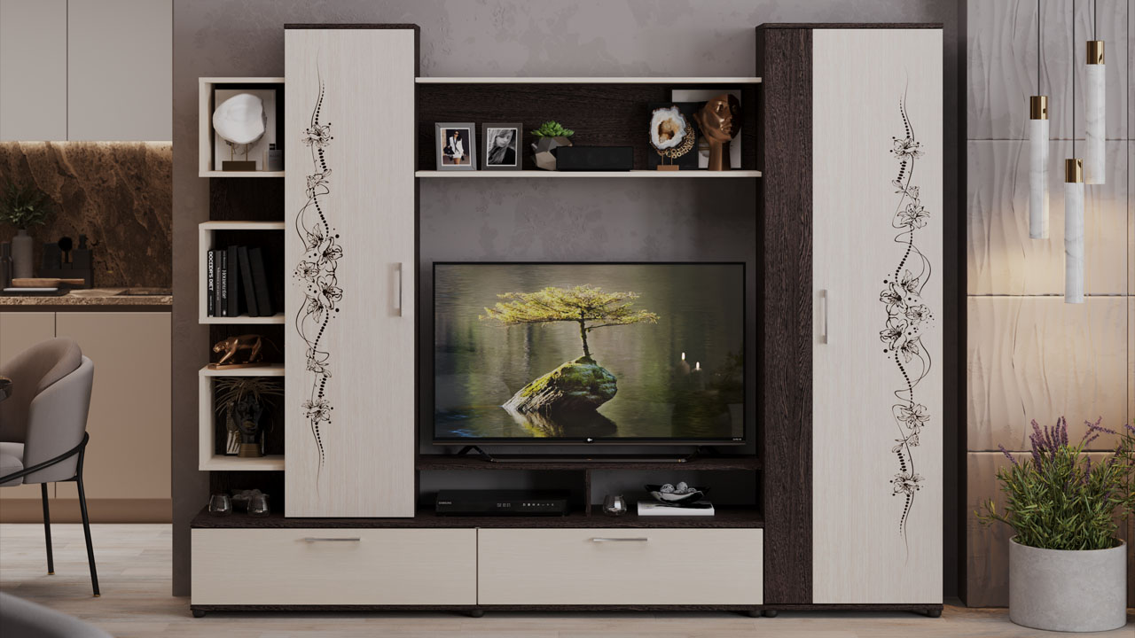 Мебель для гостиной комнаты ДАКОТА - это наилучшее сочетание цены и качества. Декоративная отделка фасада в виде цветочного орнамента придает гостиной легкость и изящество. Рисунок нанесен методом ультрафиолетовой печати, что гарантирует его сохранность долгие годы - он не выгорит и не сотрется, даже если подвергать влажной уборке.